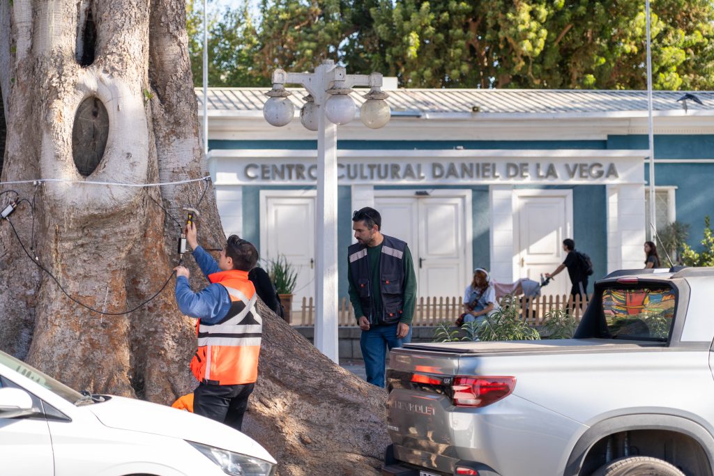 Por su parte, Álvaro Moreno, Ingeniero Agrónomo, explicó que “esta labor en general se realiza a través de ondas ultrasónicas que viajan por medio de las cavidades o el tejido pulposo del árbol para ir demostrando cómo está su estado interno en general. Siempre se realizan varias tomas dependiendo el tamaño y la dimensión del tronco y con eso uno va haciendo interpretaciones de lo que va arrojando los datos numéricos del software”.